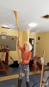 The next day we drove to Historic Deerfield to meet up with my sister-in-law again at her workplace. The day was balmy and we were given the quick tour of her historic broom-making operation. Broom corn was still standing tall in her garden. Inside the empty family education building were the historic machines for attaching the broom corn upper stalks to the stick and the mini-guillotine for chopping a straight sweeping end. Faith kindly presented us with a traditional cobweb broom she made herself.